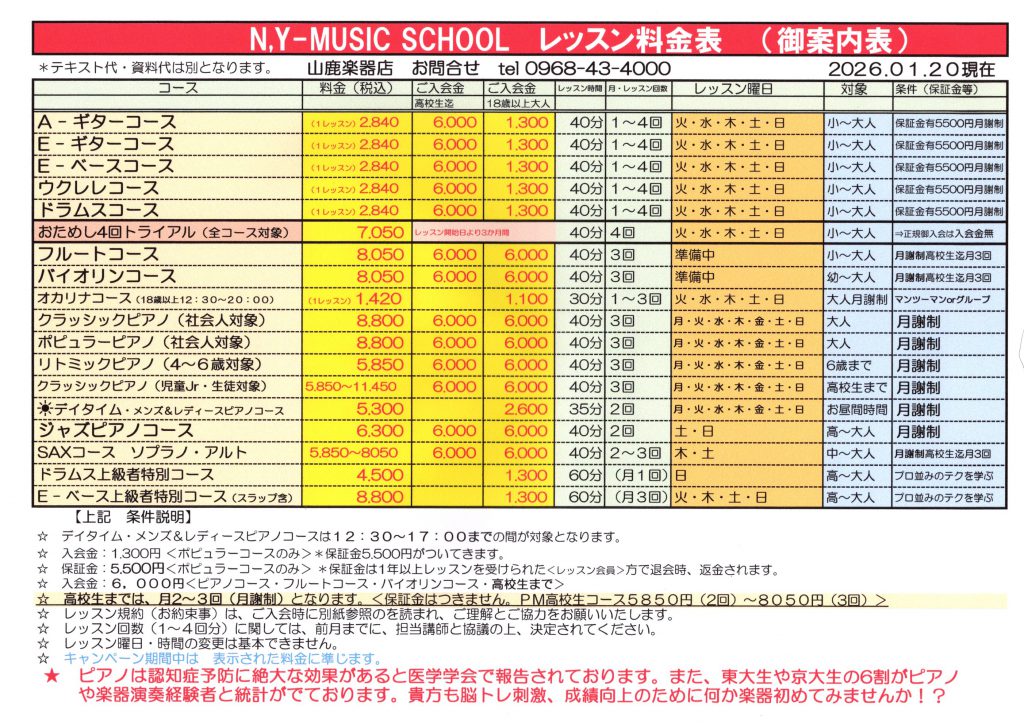 山鹿楽器店では、春のポップス、LMご入会特別キャンペーンを実施いたします。また、令和8年より18歳以上のレッスン回数を月1回から 受講可能と致します。