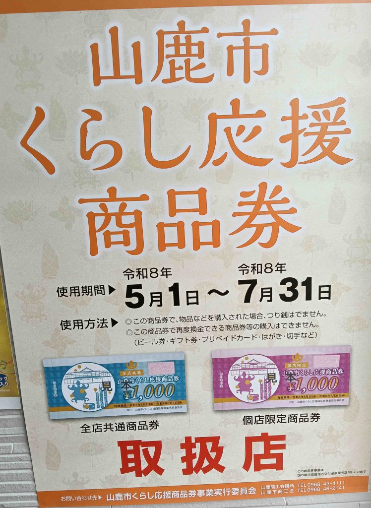 山鹿市くらし応援商品券 当店でご利用頂けます。<R8,5/1~7/31迄>
